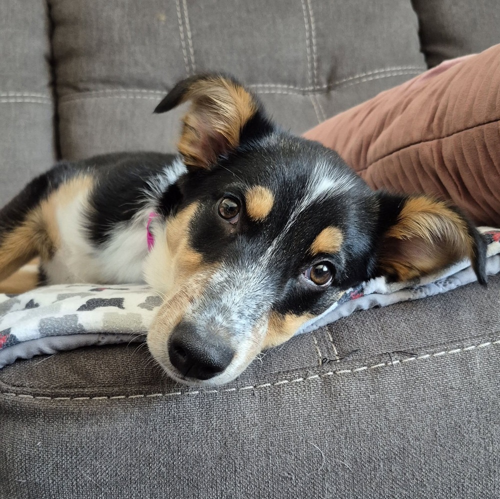 Cedar loves other dogs and will love having another dog in her future home to help entertain and exercise her. She would do best with a dog her size as she loves to PLAY, so a dog who can match her size and energy would be best. She is a busy girl who currently keeps all 3 of her foster sisters busy! She loves toy games, bones, and scent leading activities. She’s very smart and already learned some basic commands very quickly. She would do best in an active home that will keep her on the go and mentally stimulated. We suggest reading up on border collies and working breeds to get an idea of their smarts and energy level.