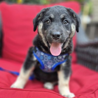 We expect that Honey Bear will be a large girl when she’s full grown, so an adopter would need to be ready and able to care for a big playful dog in her adult years. She is a mix of various working breeds, so she will require exercise and things to keep her busy. She’s very much a pack dog and wants to be around her family. She will thrive in a home that can focus on her exercise and training. She would do well with other dogs her size, or solo with pet parents who include their dog in their activities.