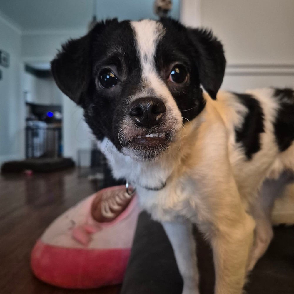 Sam is still very young, but he has a lower energy level overall. He likes to play with toys (and is happy to play by himself, or take part in a game of fetch), and enjoys some exercise and mental stimulation, but isn’t overly demanding. He’ll run around and play for a bit, but then he’s quite happy taking a nap with the other pups during the day.